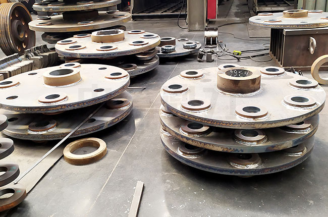 1、轉(zhuǎn)子:轉(zhuǎn)子是由主軸、錘架、圓盤、錘頭、銷軸等部件構(gòu)成,是重型錘式破碎機(jī)的主要工作部件。該轉(zhuǎn)子是支撐在兩個(gè)調(diào)心滾動的軸承上面的,圓盤上面有分布均勻的銷孔,通過銷軸來將錘頭給懸掛在轉(zhuǎn)子上面,且為了防止錘架和錘頭的晃動,需在錘架兩端壓緊錘盤或?qū)⒙菽妇o固。