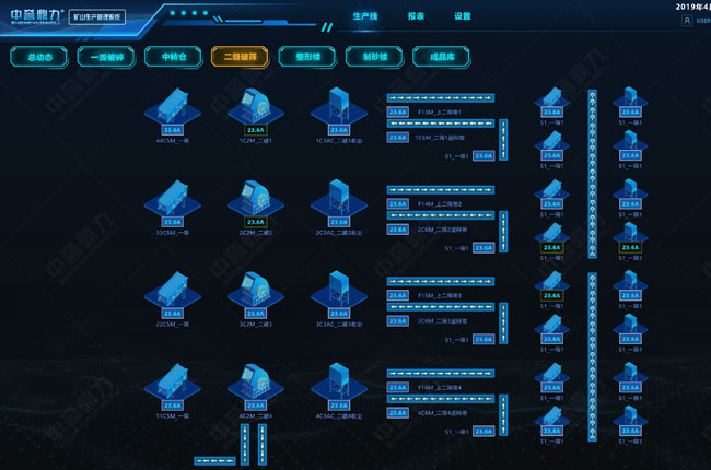 現(xiàn)代化砂石骨料生產(chǎn)線常用的集散控制手段為“礦山生產(chǎn)智能管理系統(tǒng)”。是通過計算機控制系統(tǒng),采用DCS化、模塊化和系列化設計,以通信網(wǎng)絡為紐帶,具有集中顯示操作管理、控制砂石生產(chǎn)線各環(huán)節(jié)各設備的管理,實現(xiàn)集中一鍵控制或單獨控制。