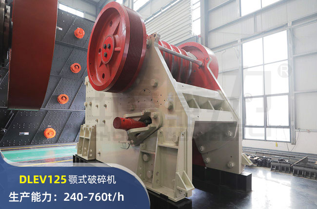 DLEV125鄂式破碎機允許的進料大小為800mm以內,排料口調整范圍為240-760mm,配備電機功率為160kw,生產能力可達760t/h。
