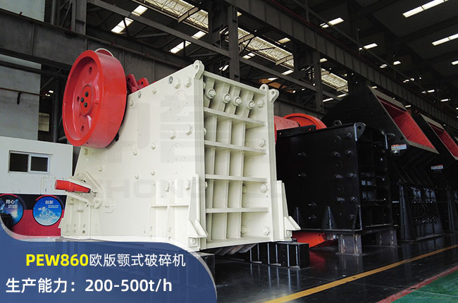 PEW860顎式破碎機(jī)進(jìn)料口尺寸860×1100mm,進(jìn)料粒度720mm,出料大小100-225mm,電機(jī)功率132kw,時(shí)產(chǎn)可達(dá)500噸左右。