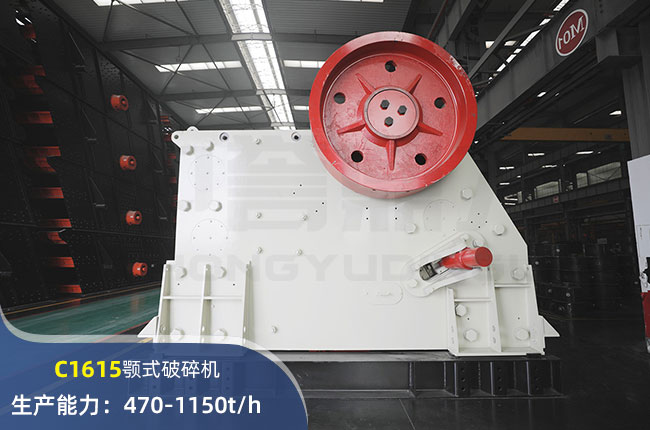 C1615顎式破碎機進料口尺寸1610×1400mm,進料粒度≤1400mm,出料大小≤120mm,電機功率250kw,時產量在1150噸左右。