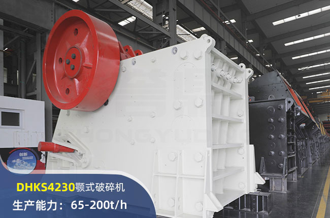 DHKS4230顎式破碎機(jī)進(jìn)料口尺寸1060×750mm,進(jìn)料粒度640mm,出料大小65-200mm,電機(jī)功率110kw,時(shí)產(chǎn)量200噸。