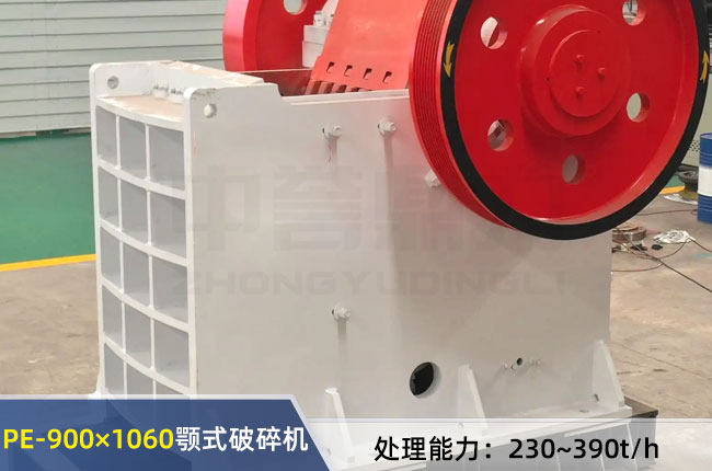 PE-900×1060顎式破碎機中的900×1060mm指進料口尺寸,進料粒度≤685mm,排料口范圍230-290mm,每小時230-390噸的產能,標配的是8p 110kw的電機,其外型尺寸是2870×2420×2940mm,設備重量33噸。