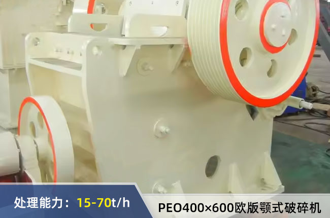 PEO400×600歐版顎式破碎機本身產量不是很高,比較適合小型砂石生產線,可以直接處理不大于350mm的各種物料,如時產60噸砂石生產線可參考:ZSW380x95給料機、4PEO46顎破、900圓錐破、4YK1854振動篩等設備配置。