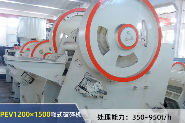 PEV1200×1500顎式破碎機進料粒度要求<1020mm,排料調(diào)整范圍180-340mm,時產(chǎn)能350-950噸之間,配備電機功率為160-200千瓦,重量為83噸。