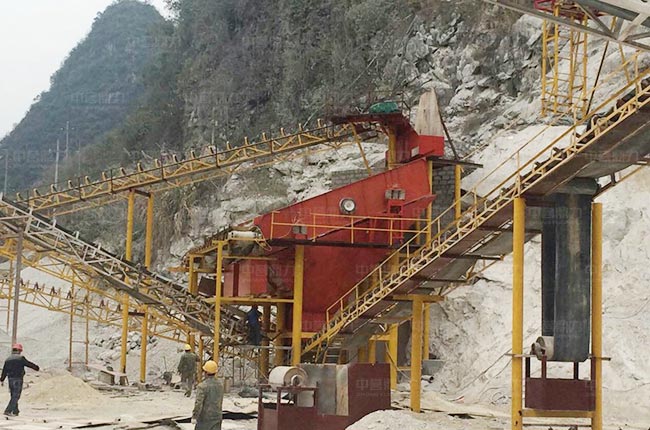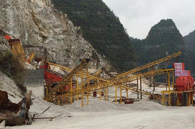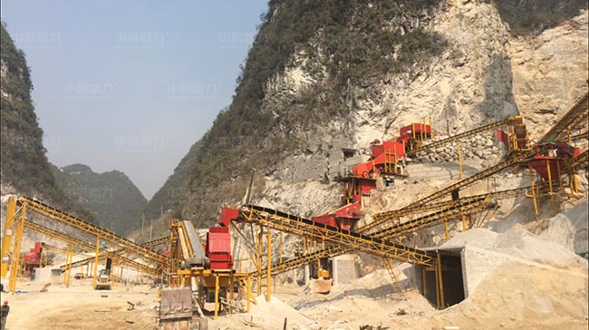 廣西河池這條時產800-1000噸建筑骨料生產線屬于階梯式設計方案,原料由棒條給料機預先篩分,其余原料通過PCZ1615錘式破碎機破碎,還有反擊破設備對不符合要求的石料進行細碎加工,生產的骨料規格多,粒型好。