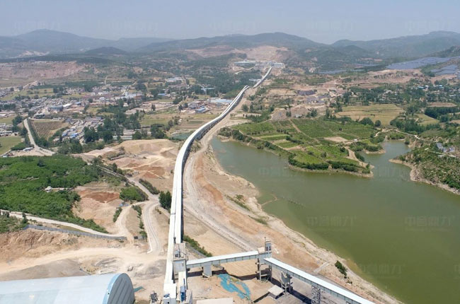 4、半成品混合料通過(guò)兩公里長(zhǎng)的皮帶長(zhǎng)廊輸送到省道旁邊的篩分銷售區(qū)域,山下篩分銷售。