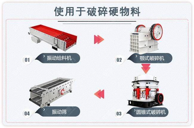 關(guān)鍵搭配機(jī)械:原料堆、ZSW490*110震動(dòng)喂料機(jī)、HD98顎式破碎機(jī)、CS430圓錐式破碎機(jī)、4YK2460礦山振動(dòng)篩、皮帶運(yùn)送機(jī)若干(依據(jù)地形搭配)
