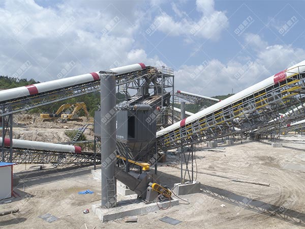 石頭由振動送料機均勻地送入顎破進行粗碎,粗碎后的石頭由皮帶運輸機送入到破沙機進行深度破碎,整型破碎后的石頭被運輸?shù)胶Y機進行篩選分級,符合成品粒度要求的石頭被送入砂石洗選機械清洗,清洗后由成品皮帶運輸機輸出即為成品;未符合成品粒度要求的石頭從篩機返回破沙機再次破碎,形成閉路多次循環(huán),成品粒度可按用戶的需要進行組合和分級,如果選擇干法加工技術(shù),可搭配粗細(xì)粉分離機和除塵機械,
