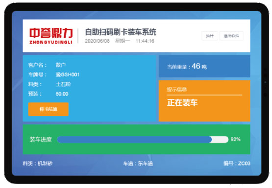 車輛稱毛重結(jié)束后,會開始砂石骨料的自動裝車環(huán)節(jié),砂石料裝車系統(tǒng)語音提示”開始自動裝車,裝載物料規(guī)格為XX”,裝車系統(tǒng)會將散裝頭根據(jù)車輛高度自動調(diào)節(jié)至合適高度,便開始自動卸料裝車。裝車結(jié)束后系統(tǒng)語音提示“裝車完成“,散裝頭會自動上升至設(shè)定位置。此環(huán)節(jié)裝載重量會通過顯示屏在司機(jī)可視范圍內(nèi)實時顯示,并且也會有監(jiān)控系統(tǒng)抓拍留證。